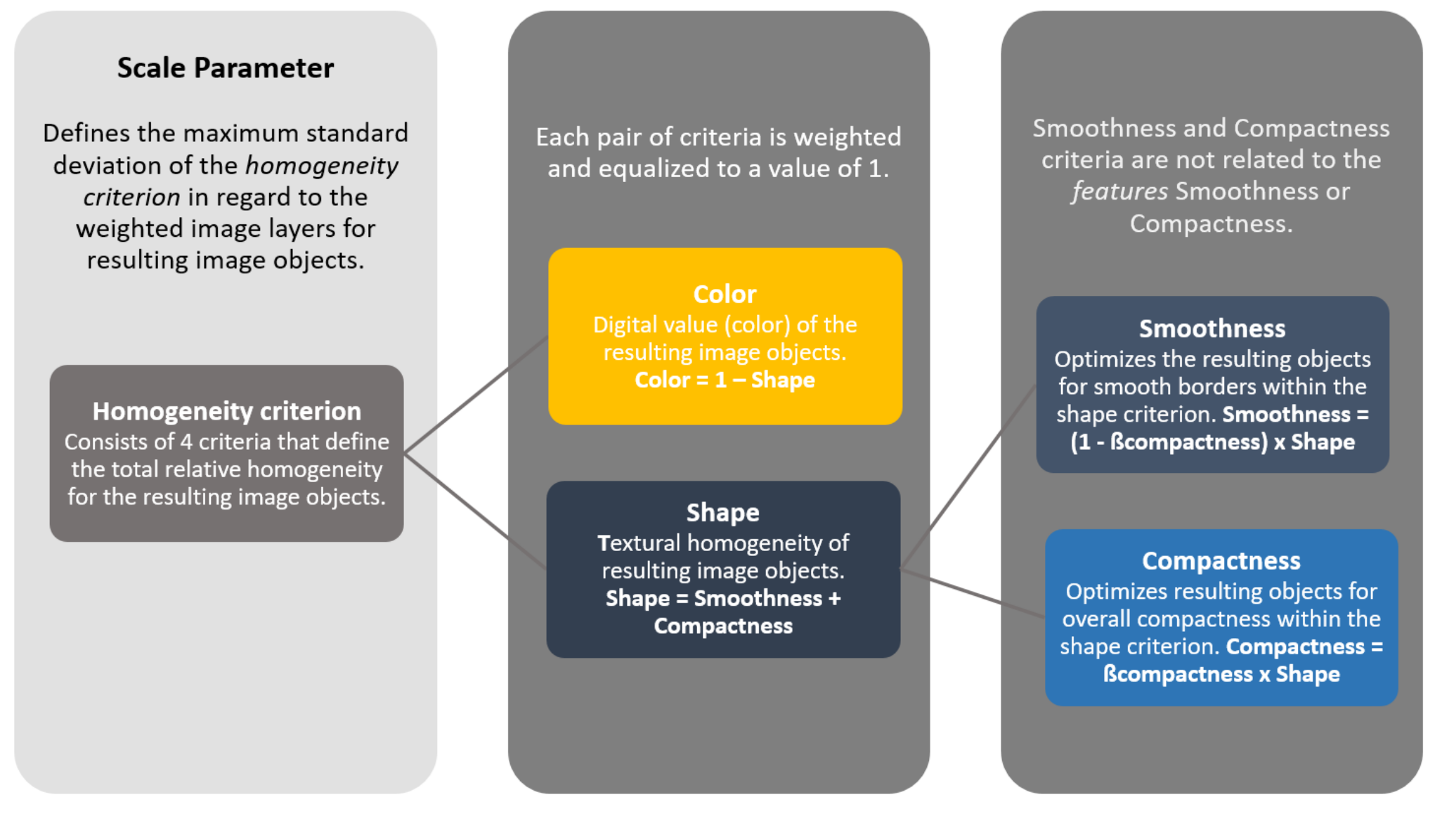 The object homogeneity to which the scale parameter refers is defined in the Composition of Homogeneity criterion field. In this circumstance, homogeneity is used as a synonym for minimized heterogeneity. Internally, three criteria are computed: color, smoothness, and compactness. These three criteria for heterogeneity may be applied in many ways although, in most cases, the color criterion is the most important for creating meaningful objects. However, a certain degree of shape homogeneity often improves the quality of object extraction because the compactness of spatial objects is associated with the concept of image shape. Therefore, the shape criteria are especially helpful in avoiding highly fractured image object results in strongly textured data (for example radar data).